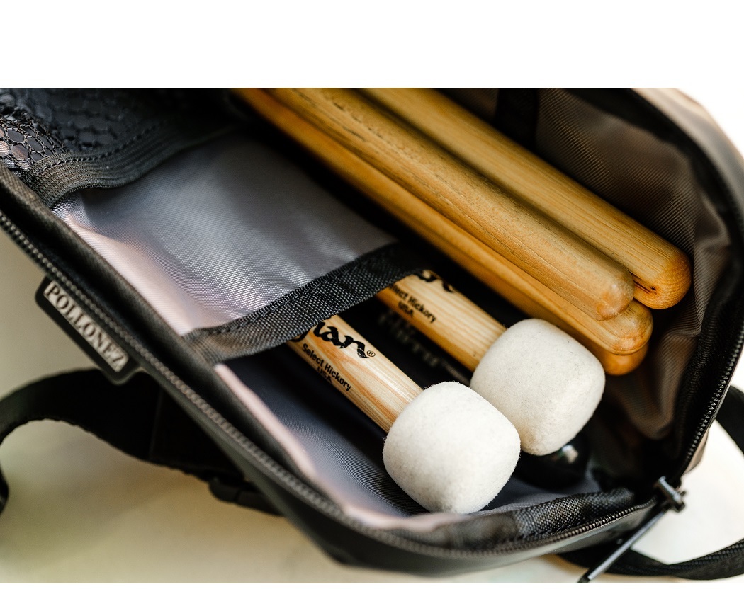 PALMIN DRUMSTICK BAG 8 — это сумка с плечевым ремнём на кнопках (фастекс) для 4–8 пар барабанных палочек с петлёй для крепления к рабочему барабану.